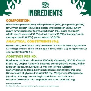 - Made without grains and rich in turkey and vegetables