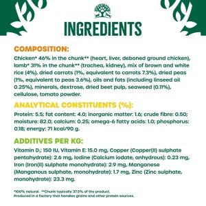Composition: chicken* 46% in the chunk** (heart, liver, deboned ground chicken), lamb* 31% in the chunk** (trachea, kidney), mix of brown and white rice (4%), dried carrots (1%, equivalent to carrots 7.3%), dried peas (1%, equivalent to peas 3.6%), oils and fats (including linseed oil 0.25%), minerals, dextrose, dried beet pulp, seaweed (0.11%), cellulose, tomato powder. *100% natural. **Chunk typically 37.5% of the product.