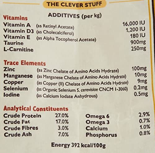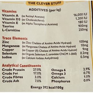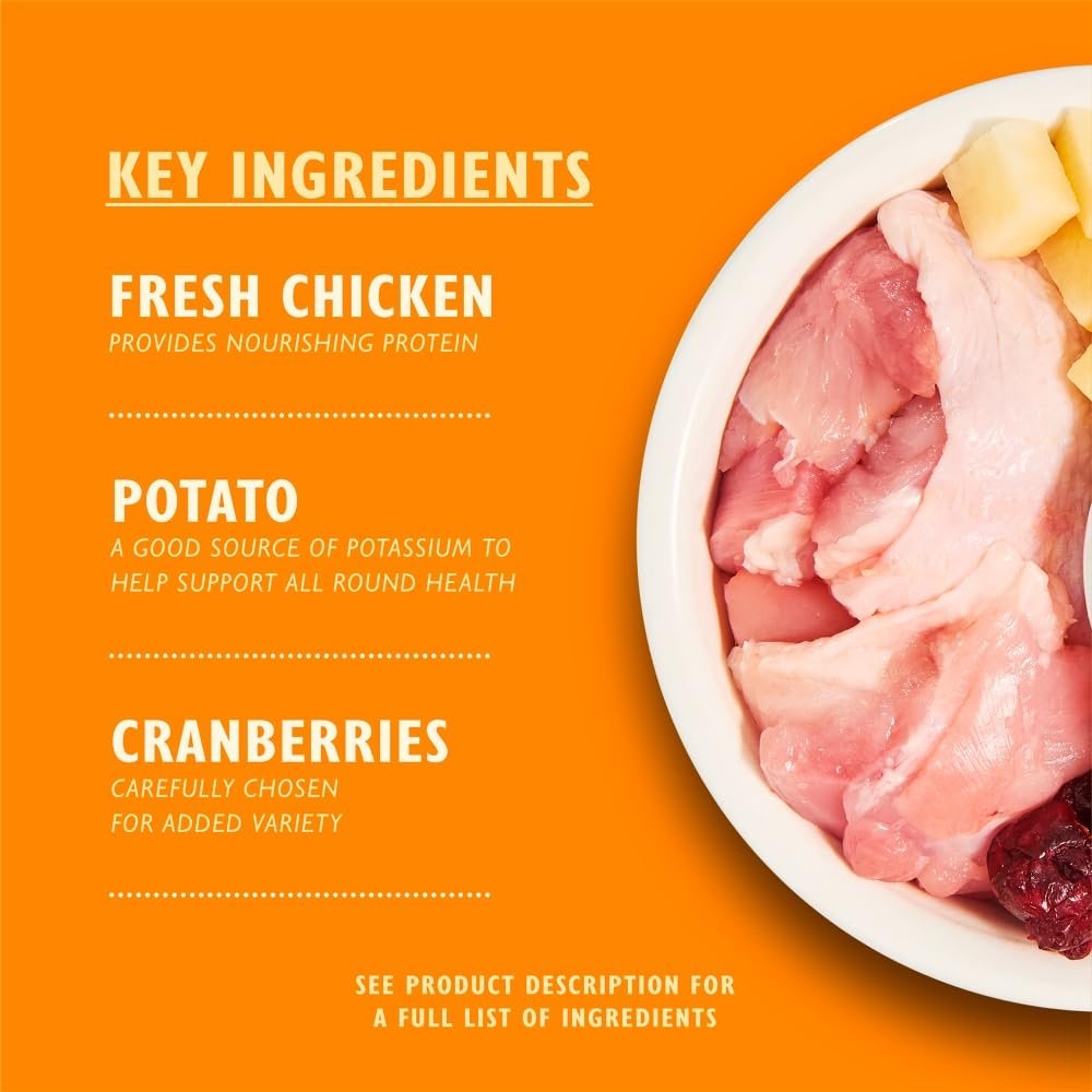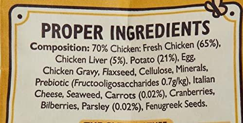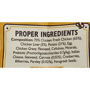 Composition: 70% Chicken: Fresh Chicken (65%), Chicken Liver (5%). Potatoes (21%), Egg, Chicken Gravy, Flaxseed, Cellulose, Minerals, Prebiotic (Fructooligosaccharides 0.7g/kg), Italian Cheese, Seaweed, Carrots (0.02%), Cranberries (0.02%), Bilberries (0.02%), Parsley (0.02%), Fenugreek Seeds (0.01%).