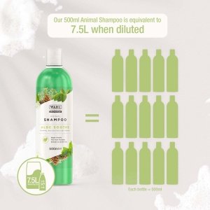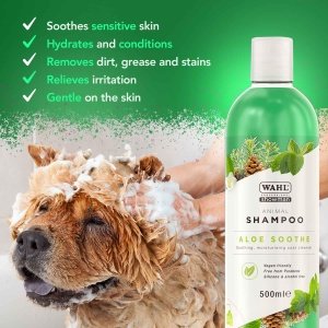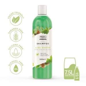 Wahl Aloe Soothe Shampoo is a carefully balanced formula developed to support your pet by conditioning their skin; calming any irritation and relieving any skin issues as it cleans. A fresh, herbal floral fragrance with hints of green pine, spearmint and eucalyptus.Based on natural ingredients including avocado and coconut to moisturise the skin, and wheat germ extract to deodorise the hair, Wahl Aloe Soothe also contains aloe vera gel that will soothe and cool the skin as the shampoo gently removes dirt, grease and stains from the coat.Wahl Aloe Soothe Shampoo also contains beneficial ingredients such as Vitamins E and C that will work with the aloe to promote healthy, glossy results every time.Wahl Aloe Soothe Shampoo is a concentrated formula that will need diluting before use. Concentrate 15:1.Free from:Paraben free, vegan friendly, silicone free, phthalates free, alcohol free, sorbates free, phosphate free, DEA free